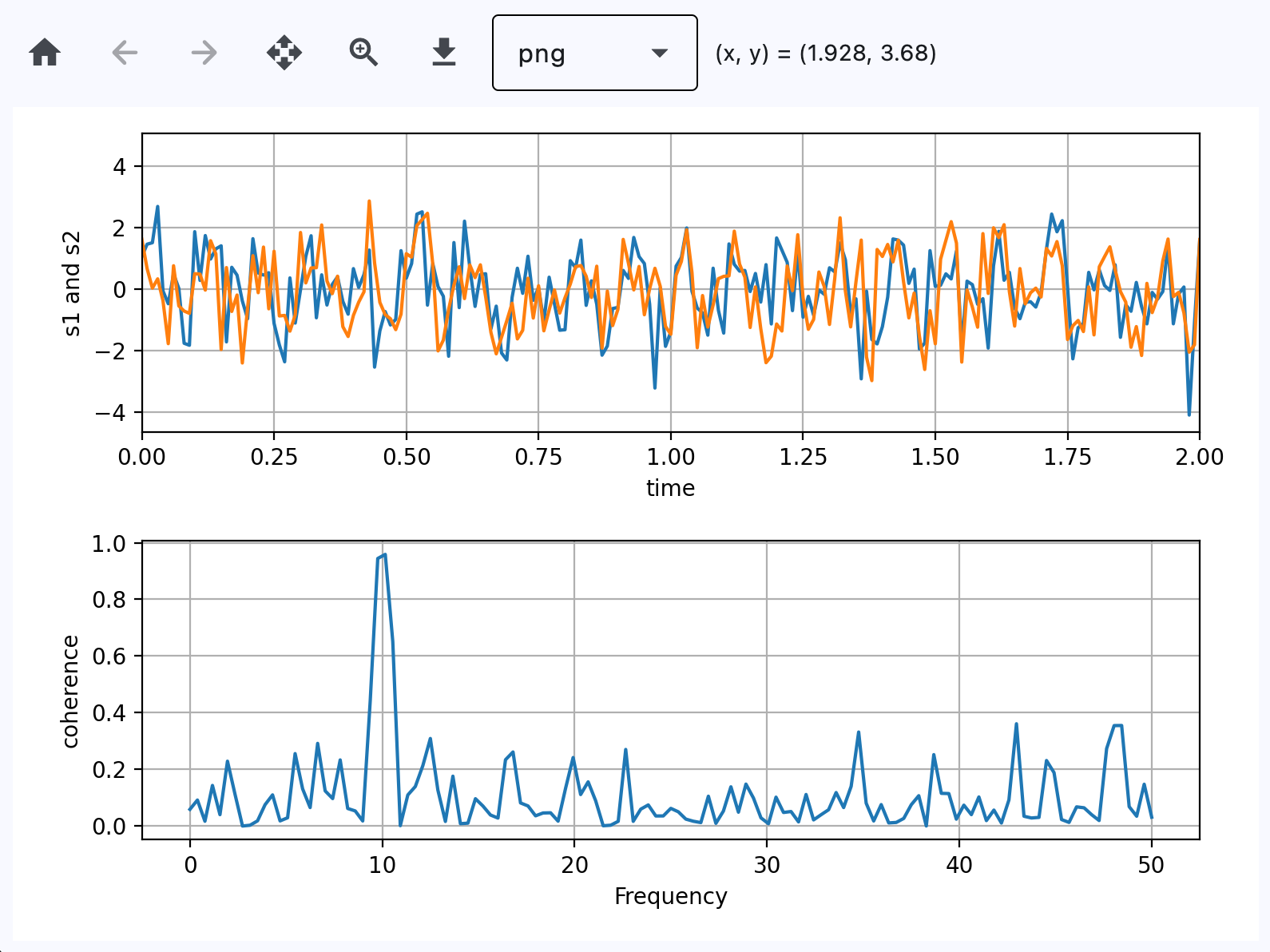 cxy, f = axs[1].cohere(s1, s2, 256, 1.0 / dt)